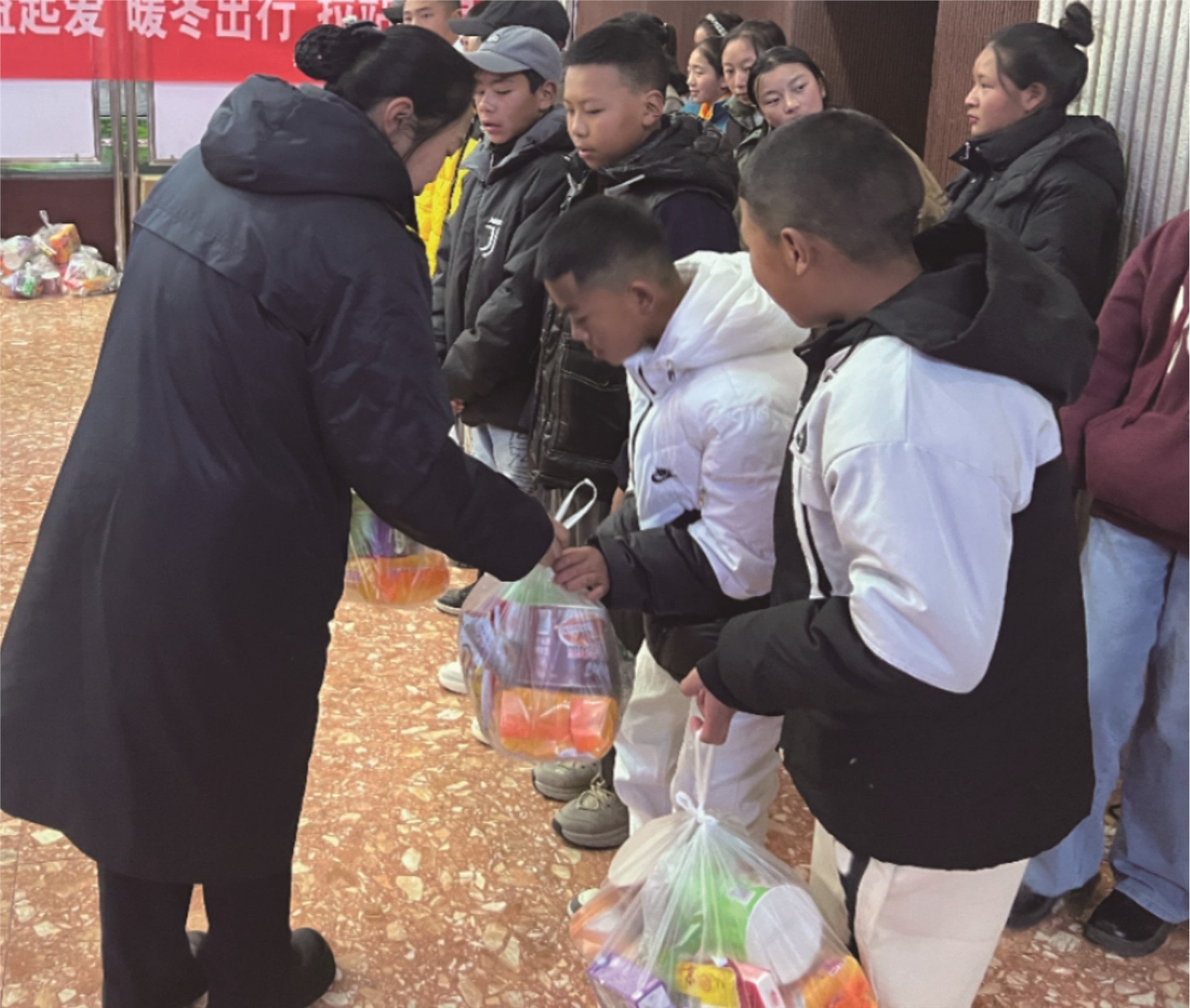 央宗为前往上海研学的孩子们递上零食包。本报记者 陈枭 摄