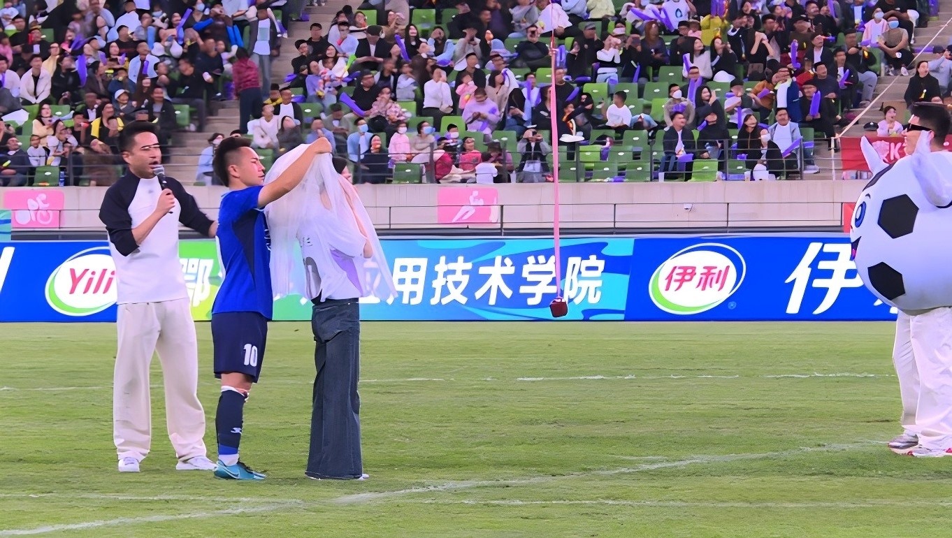 随后,赵晓东单膝跪地,正式向狄芷仪求婚。面对突如其来的惊喜,狄芷仪难掩激动,当场点头应允。两人紧紧相拥的瞬间,现场球迷纷纷举起手机记录这一甜蜜场景。