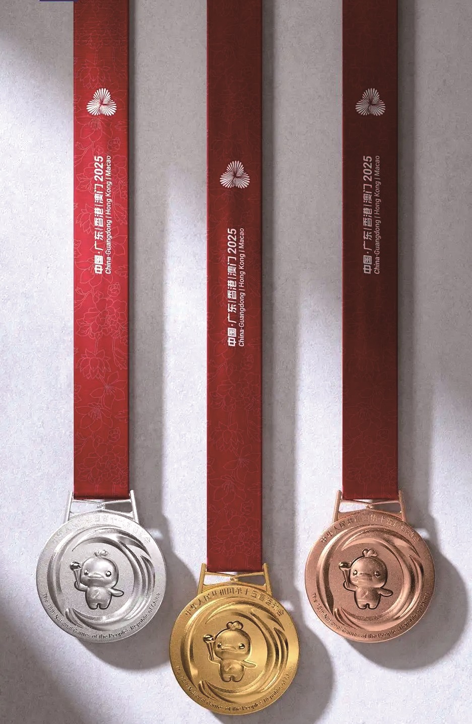 缎带颜色以“中国红”为基调,“三花映牡丹”的图案将牡丹花、木棉、紫荆、莲花融入其中;悬挂奖牌的挂环采用“同心结”造型,灵感源自港珠澳大桥……这些巧思体现了设计团队的心意:把粤港澳大湾区的城市标识与中华文化的象征结合,尽显中式美学的浪漫与韵味。