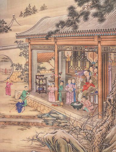富庶人家过新年,又有怎样的讲究?清代宫廷画家姚文瀚绘有大户家族新春之际于宅院团聚欢庆的《岁朝欢庆图》(台北故宫博物院藏),即展开颇为典型的图景。图中,正厅摆设酒食,长辈们围坐饮宴。家仆或持酒壶侍立,或端送糕果,穿梭于前厅回廊里。在后院偏房里,妇人们在忙碌备餐。远处阁楼上,几位男仆合力悬挂着大灯笼。在庭院中,孩子们一片欢乐喧闹,有燃放爆竹的,有携弄玩偶的,有敲锣打鼓的,有击板小唱的。三进院落,叠石假山,庭院里讲究的红木火盆,正厅中气派的“四季花卉”大立屏、典雅的朱几瓶插牡丹,无不凸显主人的身份,烘托出满堂富贵的年味。