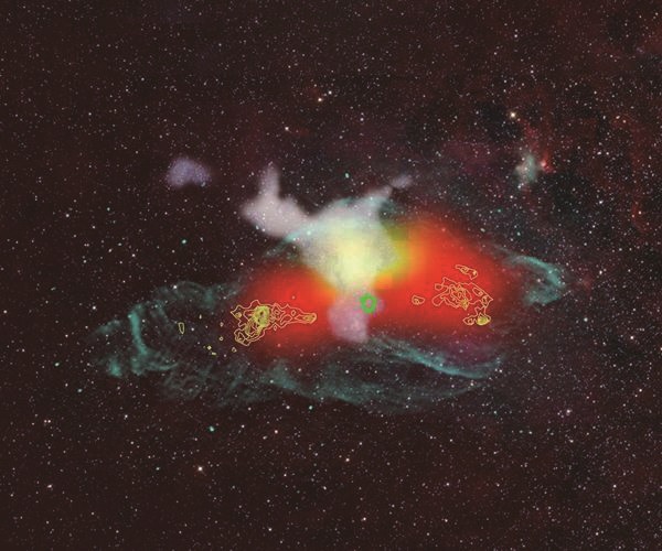距离地球最近的著名微类星体SS 433。中央绿色的等高线显示出黑洞附近吸积过程产生的x射线分布,左右两侧比较对称的等高线显示了喷流端头粒子加速区发出的x射线分布,与之对应,红色表征了拉索测到的TeV伽马射线辐射分布。靠近中上的黄色显示了拉索首次测到的超高能伽马射线辐射分布,与白色显示的原子气体很好重合,支持超高能伽马射线的强子起源,表明SS 433能够把质子加速到PeV能区。