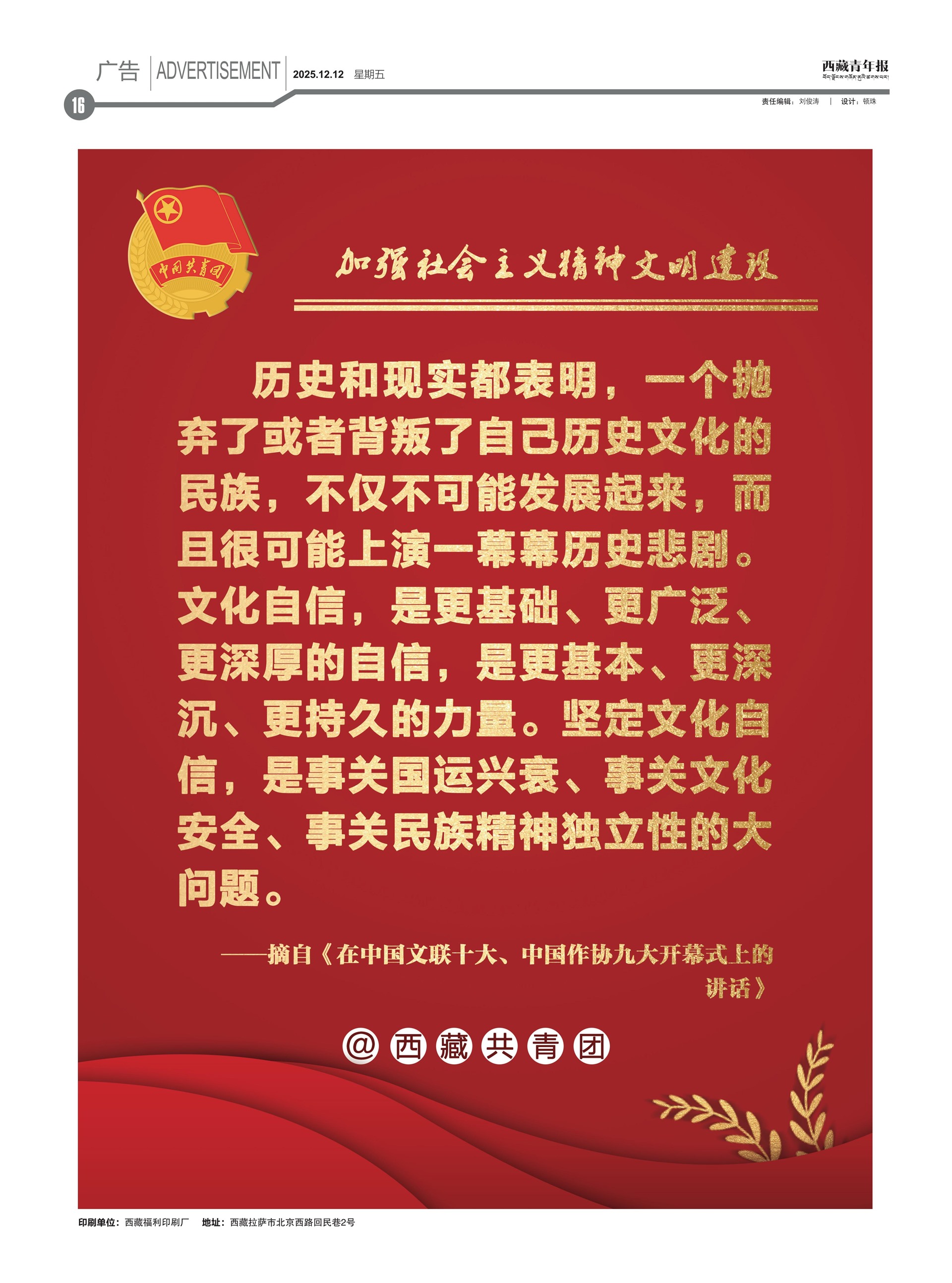 西藏青年报社出版 | 国内统一刊号:CN54—0006 | 邮发代号:67—11