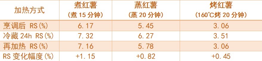 做熟的红薯经过冷却,RS3抗性淀粉含量确实会增加,但增加幅度很小。2019年《宫城教育大学纪要》上的一篇日本的研究对比了红薯经过蒸、煮、烤后再冷藏24小时,抗性淀粉的变化,结果显示:煮/蒸红薯冷藏24小时,抗性淀粉一般会出现0.8%~1.2%的上升,其中烤红薯上升相对最少,只有0.45%,如果再加热却与刚烤好几乎没有差别。并且,无论是煮(68%)、蒸(62%)还是烘烤(63%),所有烹饪方式的红薯可消化淀粉含量均超过 60%。